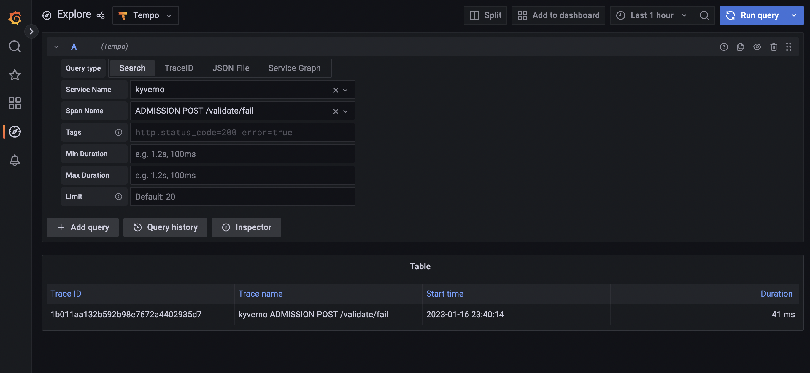 Finally we will exercise the Kyverno webhooks by creating a Pod, then we will use Grafana to find and examine the corresponding trace.